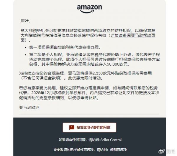 亚马逊确实有所举措。邮件中提出,如果卖家缴纳保证金,或者采用保函的形式,亚马逊提出2350欧元的补贴。看得出,亚马逊比较赞成卖家缴纳或者保函。