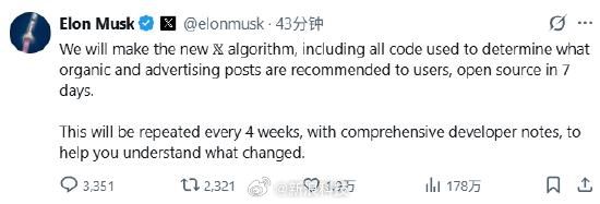 【#马斯克宣布X平台将开源算法#,后续每四周更新一次代码】马斯克今日发文称,X平台将在七天内面向公众开源其新版算法。