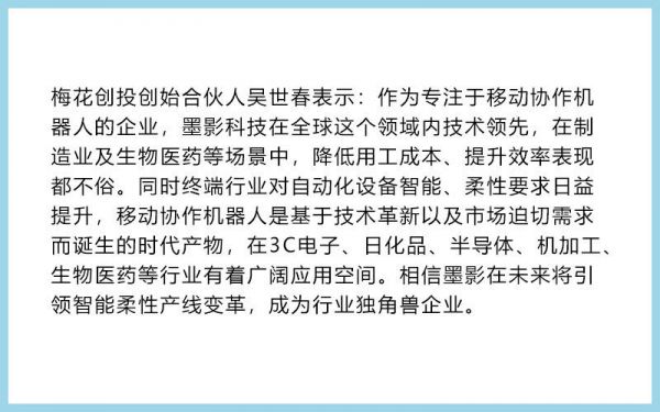 此轮融资后,墨影科技将加大研发投入,增强产品与市场地贴合度,同时也将加大供应链建设,实现产品质量提升与成本优化,同时也将进一步加大市场开拓力度,将移动协作机器人推广向市场。
