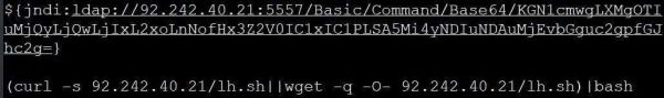 例如,上文提到的 BleepingComputer 报道中提到一个现有的真实案例:攻击者将一段使用 base64 编码的终端脚本附在 JNDI 查询指令中,导致被攻击机器下载并安装了挖矿程序: