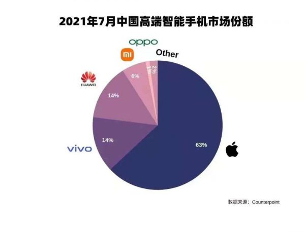 而华为的出局,直接让苹果重返中国第一,根据Counterpoint的数据显示,7月的中国高端智能手机市场份额中,苹果的市场份额占比高达63%,吃掉了大部分高端机市场。