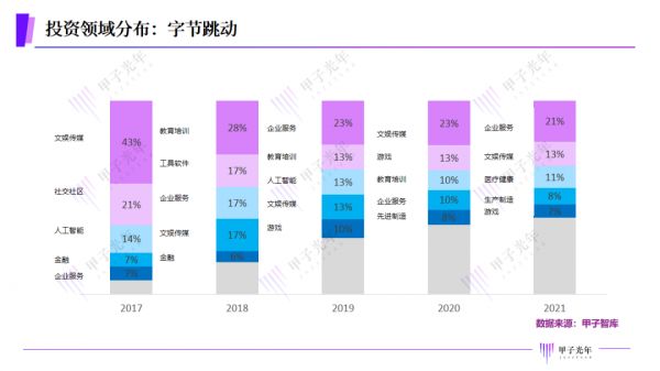 同样长于社交、流量的字节跳动,投资逐渐“腾讯化”。从领域上看,文娱传媒都是两家多年的投资重头。除此之外,企服、医疗等近年来字节大力加码的领域,也是腾讯科技投资的重头。