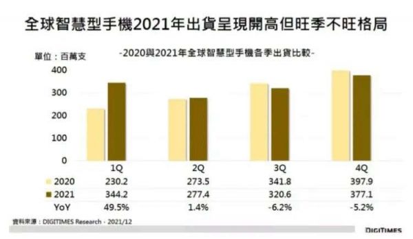 近日,据DIGITIMES Research研究与统计,进入2021年下半年,全球智能手机出货不见上半年的增长气势,反而连续两季出现出货量衰减的现象。2021年全球智能手机出货量为13.2亿部,年增长率为6.1%,这一数据虽然相比去年有所上升,但是整体涨势依旧不够理想。