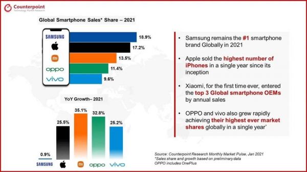 具体到品牌上,根据市场调研机构Counterpoint Research发布的数据显示,三星依然稳稳待在全球智能手机市场榜单首位,毫无意外地夺得了2021年全球智能手机市场的出货冠军。如图所示,去年三星智能手机销量占全球总体销量的18.9%,约为2.5亿部,同比增长0.9%,位列全球第一。