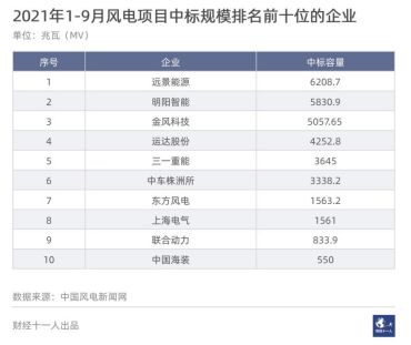 图2显示,2021年前三季度,远景能源的订单量为6208.7MW,大幅领先于金风科技的5057.7MW。另据国际能源网/风电头条统计,12家央企2021年全年采购的风机里,远景能源拔得头筹,累计中标6794MW,而金风科技累计中标5866MW,排名第二。这12家央企2021年的风电招标量约占全国新增风电装机的四分之三。