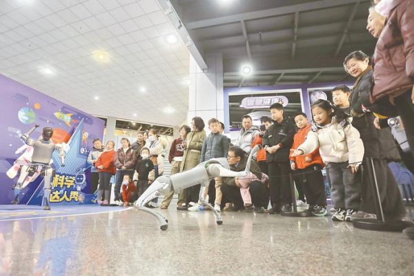 1月2日,在浙江省嘉兴市科技馆,小朋友在“新质生产力·未来新引擎”科普主题展上与人形机器人和机器狗互动。 新华社 发 金鹏 摄